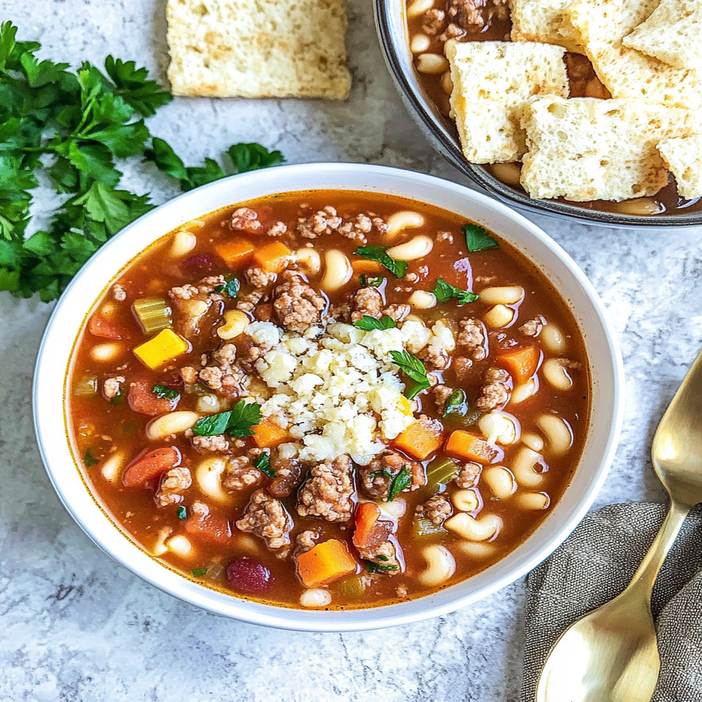 Slow Cooker Hamburger Minestrone is a cozy, hearty soup that combines savory ground beef with fresh vegetables and aromatic herbs. Perfect for chilly evenings, this dish simmers gently in your slow cooker, filling your home with an enticing aroma. It’s a comforting meal that brings warmth and joy to the table, making it ideal for sharing with family and friends.