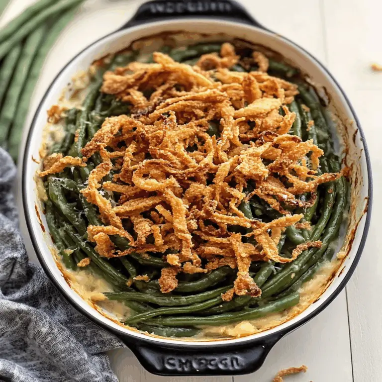 Green Bean Casserole with Crispy Onions is a classic comfort dish that brings warmth and flavor to any table. Tender green beans are enveloped in a creamy, savory sauce and topped with crunchy fried onions, creating a delightful contrast in every bite. Perfect for holiday feasts or weeknight dinners, this easy-to-make casserole is sure to become a family favorite, evoking cherished memories with each serving.