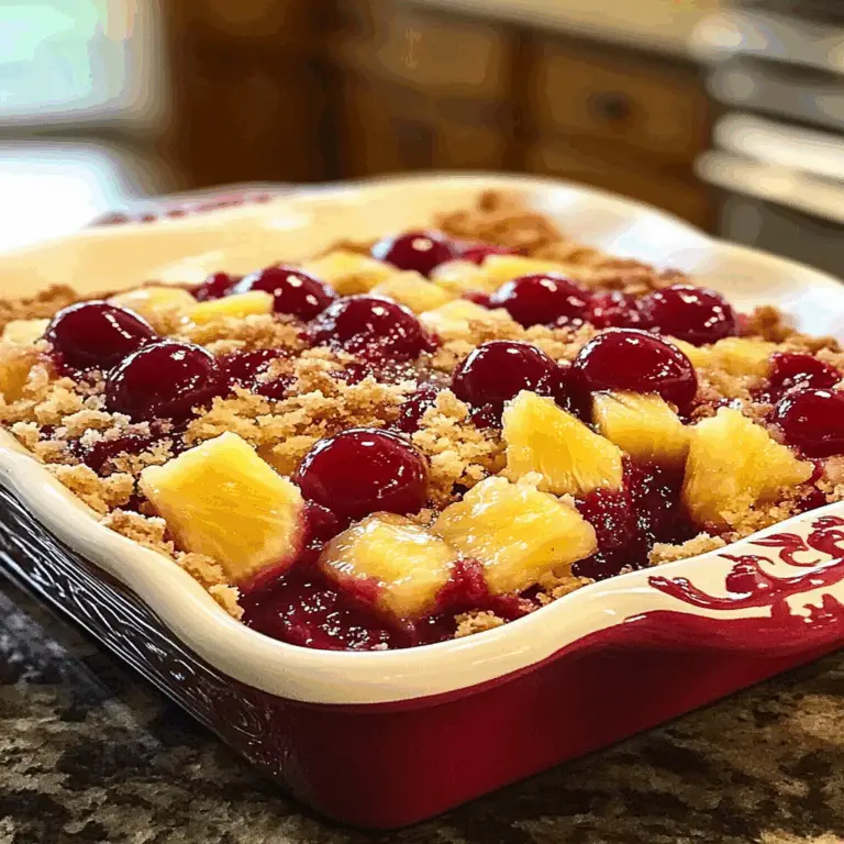 In summary, the Cherry Pineapple Dump Cake Easy and Delicious Treat is a simple yet delightful dessert perfect for any occasion. With just a few ingredients and minimal preparation, this treat combines sweet cherries with tangy pineapple under a buttery cake layer. Whether served warm or cold, this dessert is sure to impress your family and friends. Enjoy experimenting with various toppings or fruit combinations to make it uniquely yours!