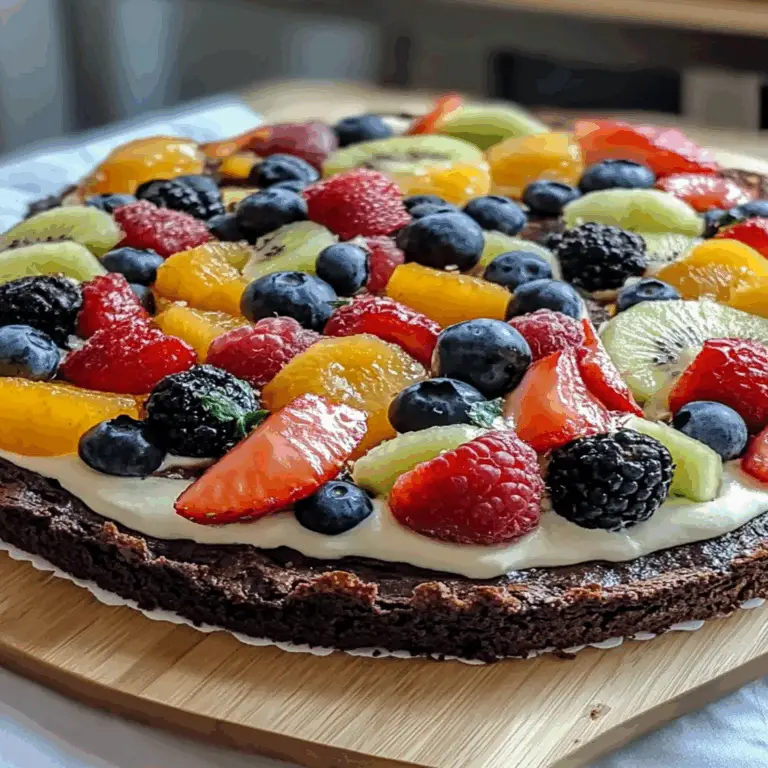 Brownie Fruit Pizza is a colorful, decadent dessert that combines a rich brownie base with an assortment of fresh fruits. Perfect for parties and gatherings, this delightful treat features a creamy whipped topping and a drizzle of chocolate sauce, making it both visually stunning and irresistibly delicious. Easy to customize with seasonal fruits, this dessert will surely impress your guests and satisfy your sweet cravings!
