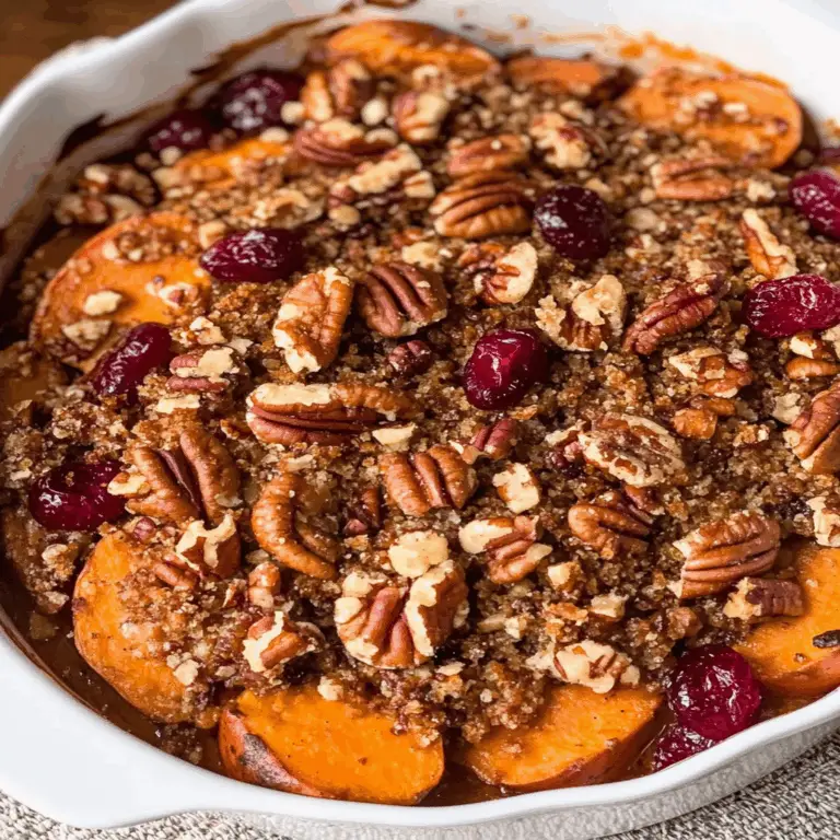 Cranberry Pecan Sweet Potato Casserole is a delightful blend of creamy sweet potatoes, tangy cranberries, and crunchy pecans. This dish is perfect for cozy family gatherings or holiday feasts, bringing warmth and flavor to your table. Easy to prepare and visually stunning, it’s sure to impress your guests and leave them asking for seconds.