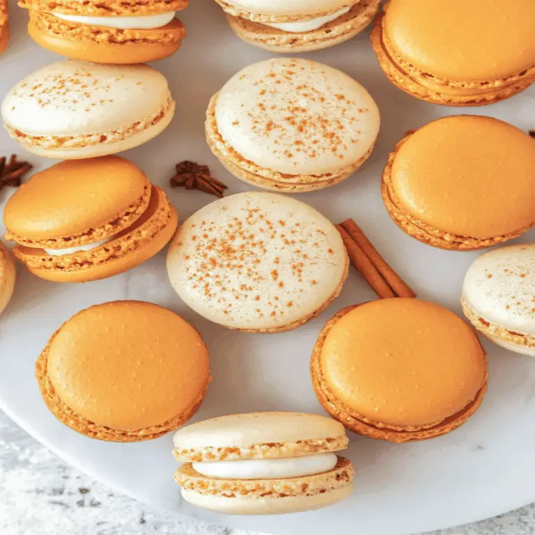 Pumpkin Spice Macarons are a delightful fusion of autumn flavors and French pastry elegance. These delicate cookies feature crisp almond flour shells filled with a velvety pumpkin spice cream, making them perfect for cozy gatherings or festive occasions. With their vibrant colors and irresistible aroma, these macarons will impress friends and family while filling your kitchen with the warmth of fall.