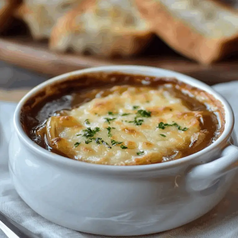 Indulge in the comforting warmth of Restaurant Style French Onion Soup. This classic dish features sweet, caramelized onions simmered in rich beef broth, topped with crusty baguette slices and melted Gruyère cheese. Perfect for chilly evenings, each bowl delivers a delightful combination of flavors that brings friends and family together. Easy to make yet impressive enough for guests, this soup creates unforgettable memories around the dinner table.