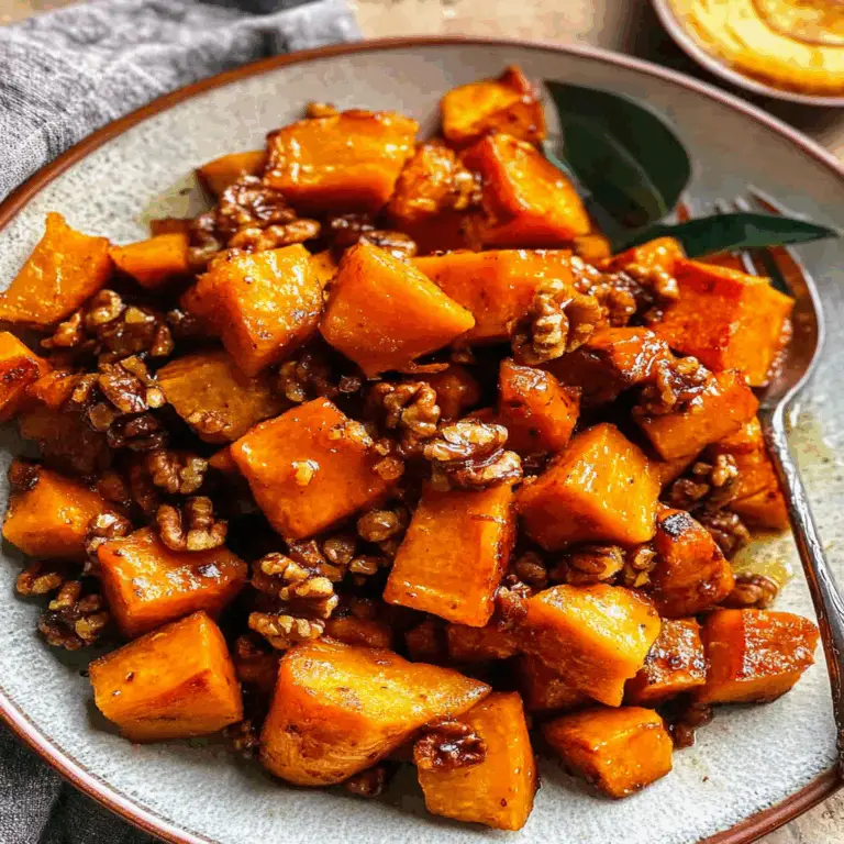 Roasted Butternut Squash with Candied Walnuts is a comforting autumn dish that beautifully marries sweet and savory flavors. The buttery squash, roasted to caramelized perfection, pairs wonderfully with the crunchy, sweet candied walnuts. Perfect for holiday gatherings or cozy family dinners, this easy-to-make recipe will impress your guests while filling your home with delightful aromas.