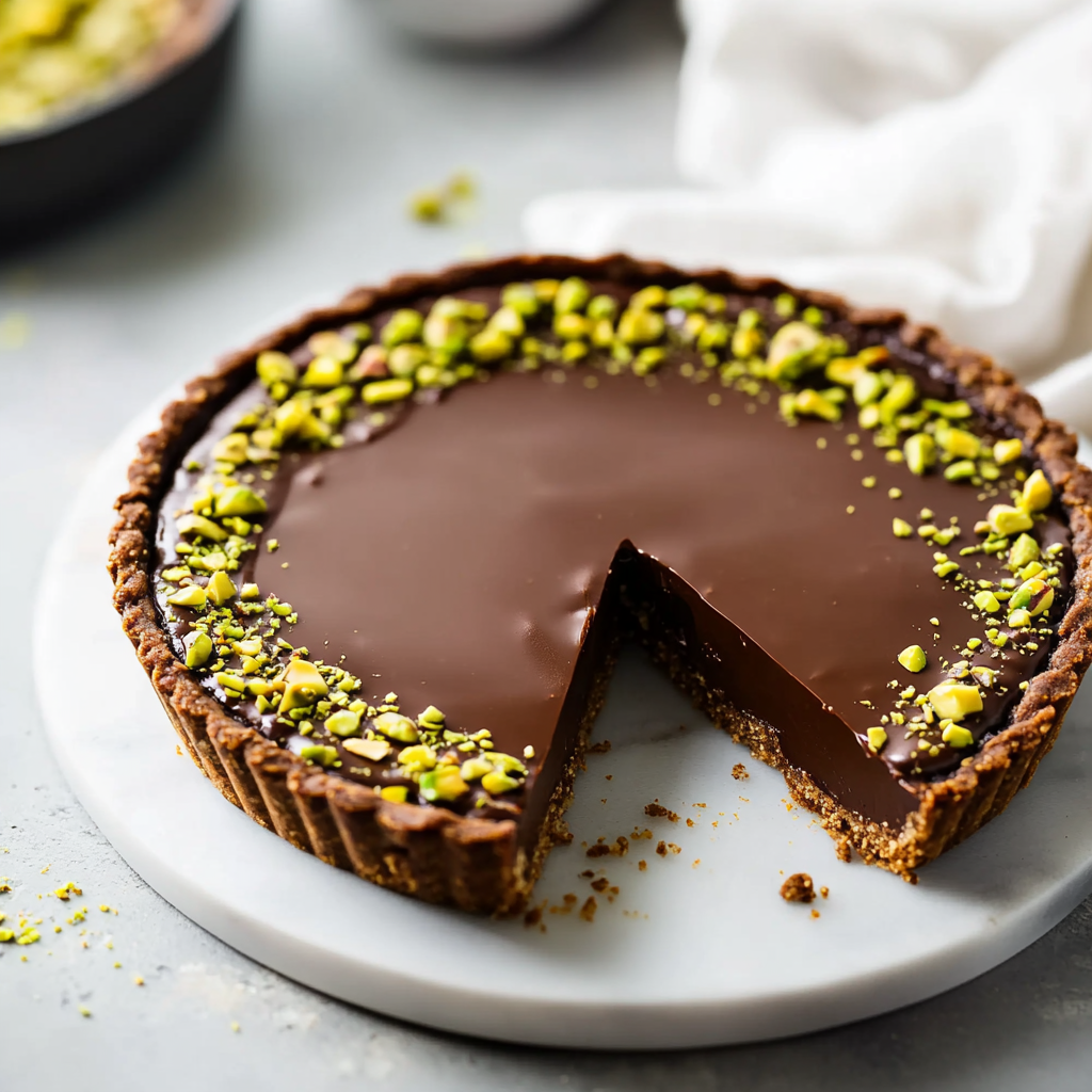 Indulge in the decadent No-Bake Chocolate Tart with Pistachio Paste, a delightful dessert that combines rich chocolate and creamy pistachio for an unforgettable treat.